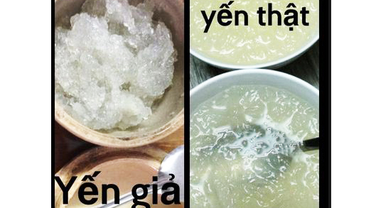 Tổ yến sào dùng tinh hoặc cùng với nhiều nguyên liệu khác để làm giả thành các sợi yến chồng chéo lên nhau đánh lừa người dùng. Tuy nhiên, bạn có thể phân biệt bằng cách ngâm yến trong nước lạnh 2 - 3 phút. Nếu như sợi yến nở to hoặc khi bóp yến thấy nhanh nhão thì chắc chắn bạn đã mua phải yến giả.