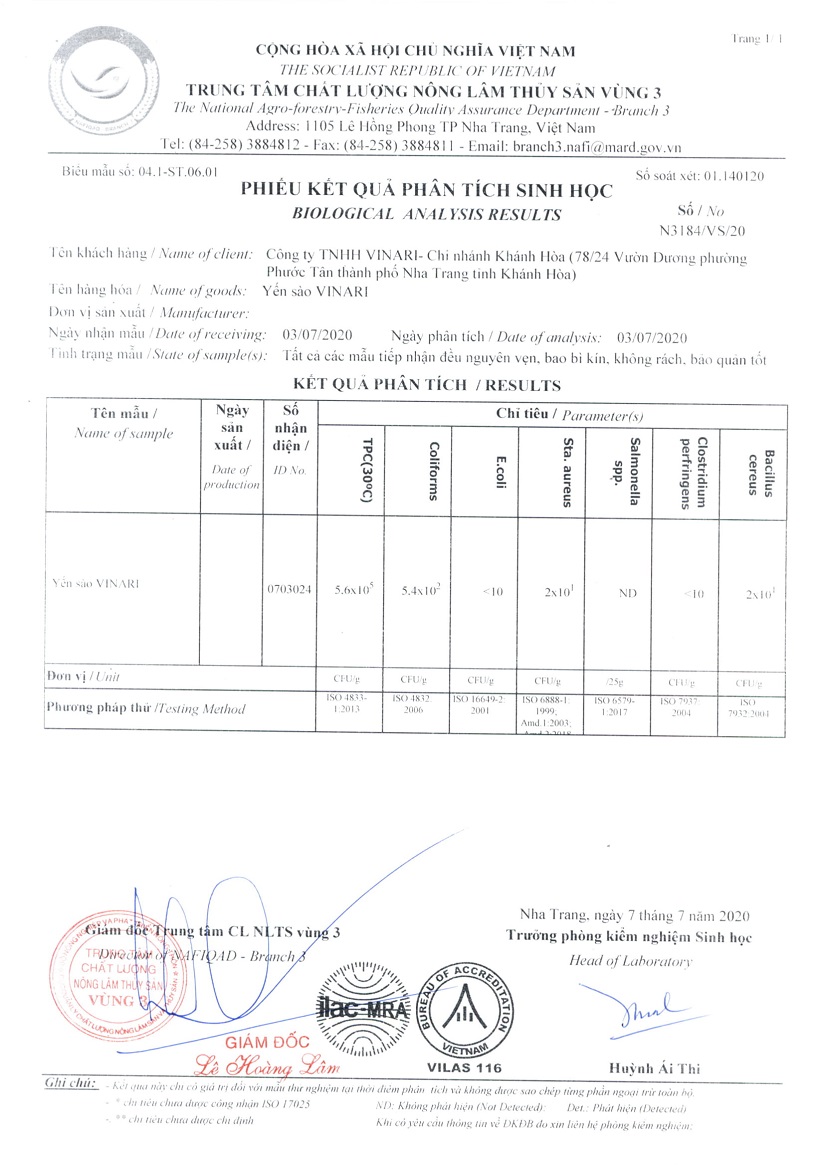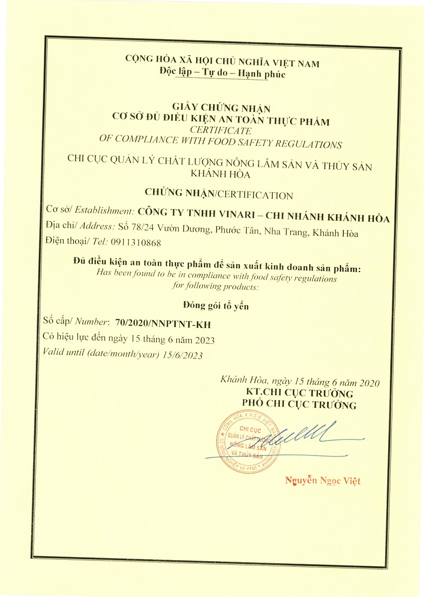 Sản phẩm yến sào baby Huyền Thuynh đạt đầy đủ tiêu chuẩn vệ sinh an toàn thực phẩm của Bộ Y Tế