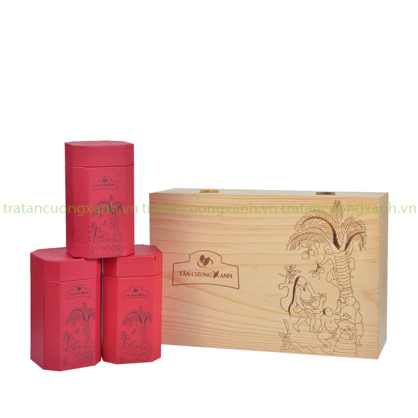 Mô tả : 300gram trà shan tuyết bạch ngọc hút chân không và đựng trong 3 hộp nhỏ giấy nhỏ và đựng trong hộp gỗ thông Đà Lạt sang trọng