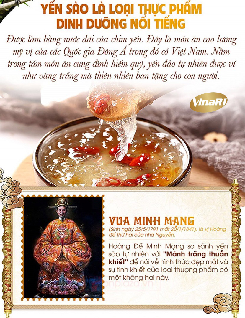 Yến sào khánh hoà là một sản phẩm nổi tiếng thơm ngon của Việt Nam, giá trị dinh dưỡng cao, những tổ yến được lấy khi chim yến đã bỏ tổ và được thu hái để làm thực phẩm. Từ xa xưa yến sào đã là một món ăn đắt đỏ và nhiều chất dinh dưỡng được những quý tộc lựa chọn làm cao lương mỹ vị. Ngày nay do điều kiện kinh tế nâng cao thì yến sào khánh hoà cũng chở thành một món ăn rất phổ yến trong mọi gia đình